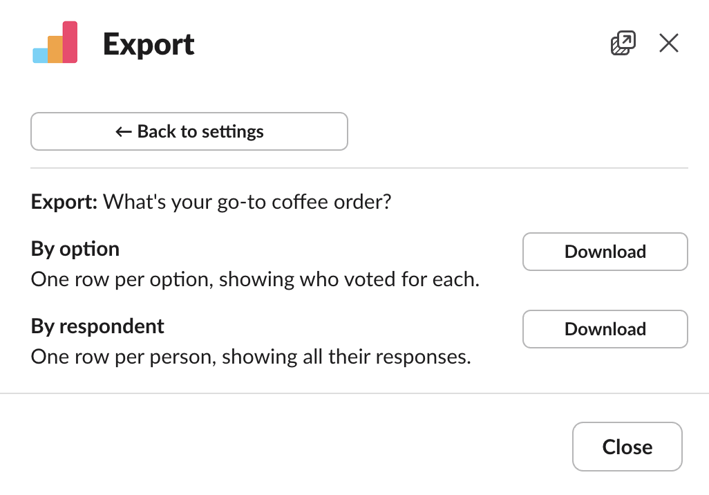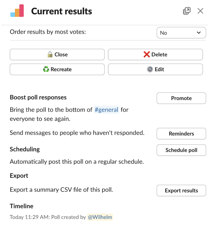 - We have released our API which will allow you to programmatically create polls in Slack as well as retrieve the results. Full details can be found in this support article.