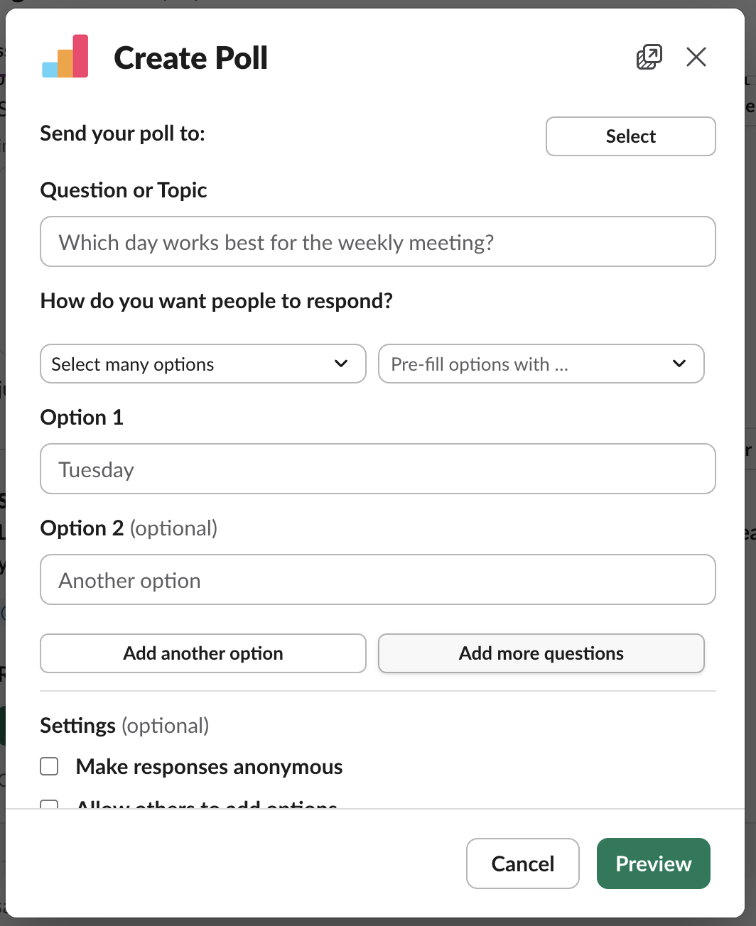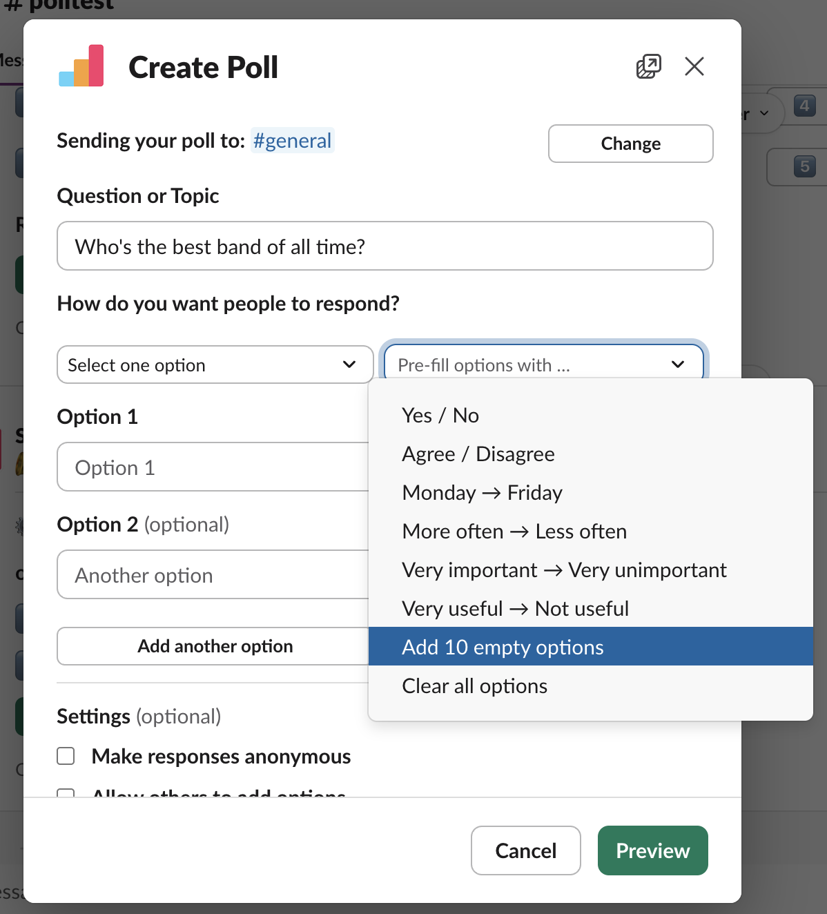It just got easier to create a poll with lots of options. The 'Pre-fill options with...' drop-down now has the option to "Add 10 empty options.