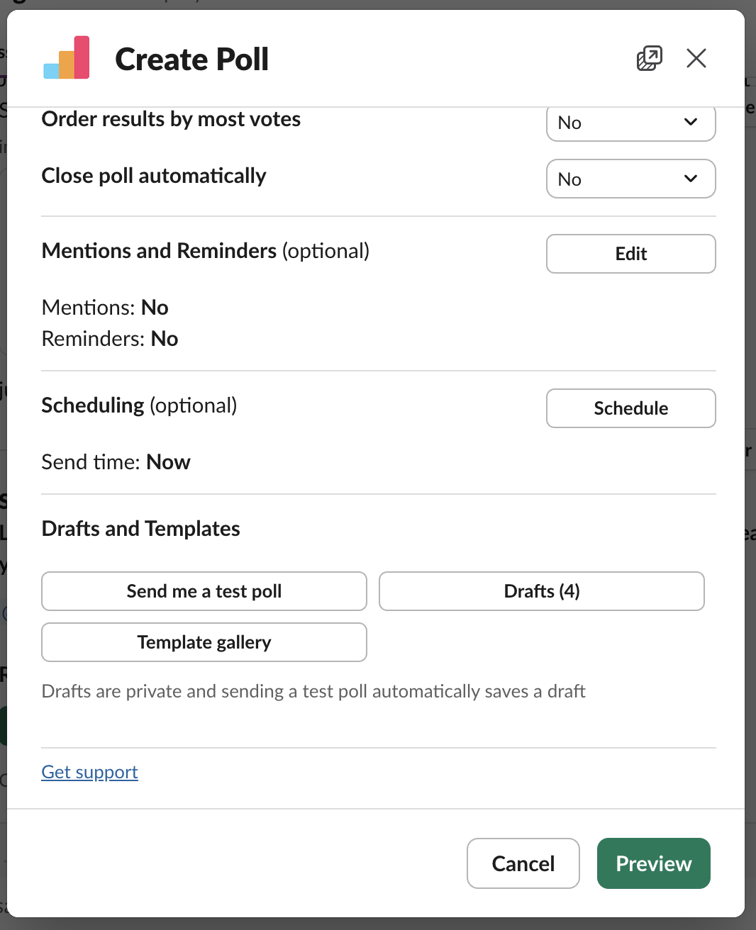 - The "Drafts (3)" and "Template gallery" buttons have been moved to the bottom of the Create Poll. Additionally the "Save draft" button has been removed and the "Send me a test poll" button is now the regular colour instead of the primary/green.